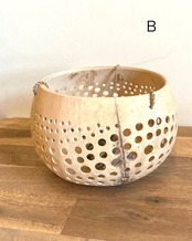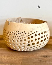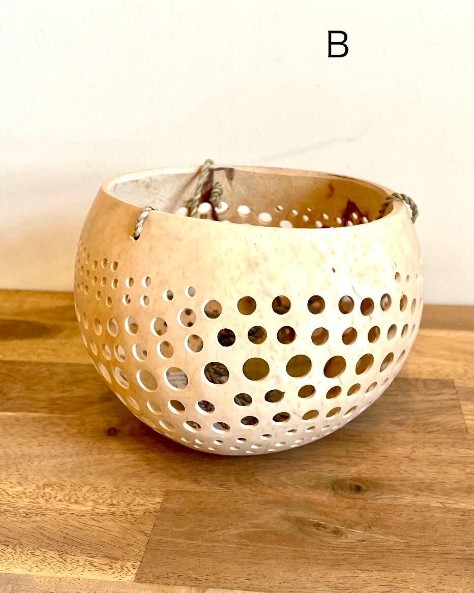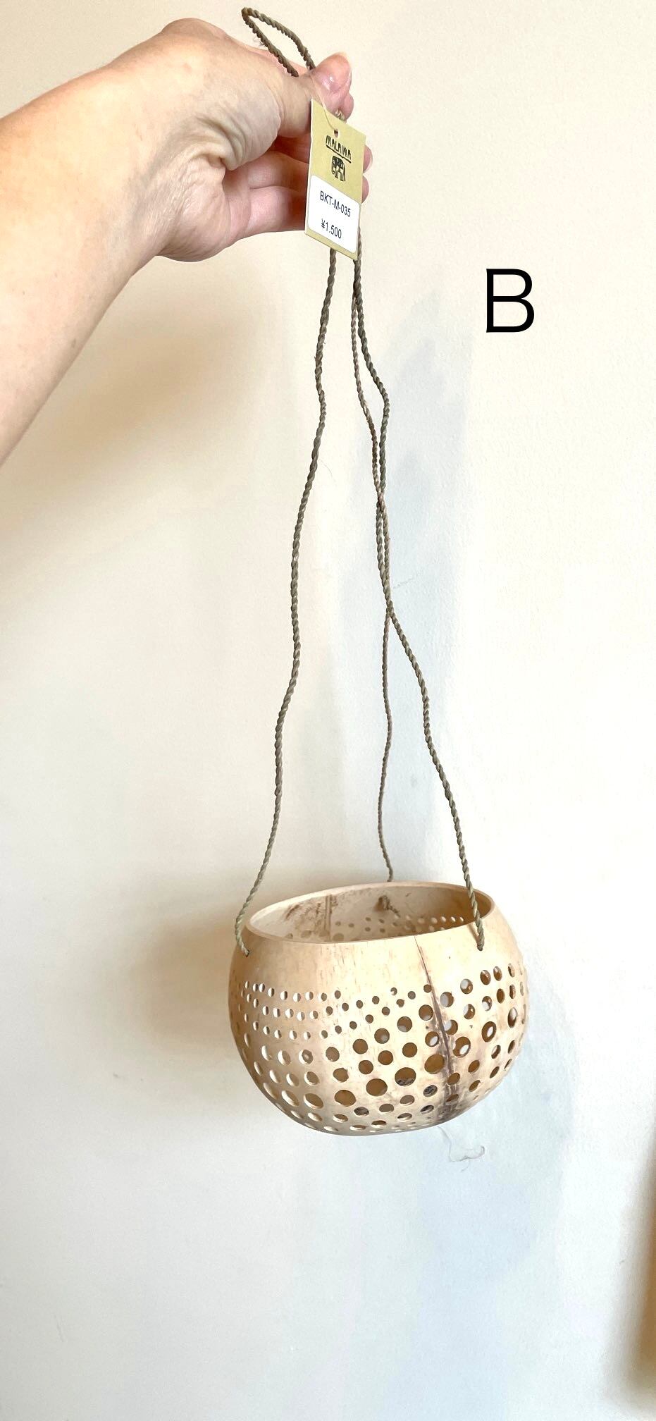 天然のココナッツシェルの中身をくりぬいて作ったハンギングタイプのボウル。ナチュラルな色合いがどんなタイプのお部屋にもマッチやすい。壁からフックで吊るしてちょっとした小物入れに。
