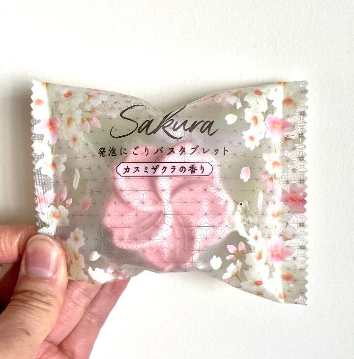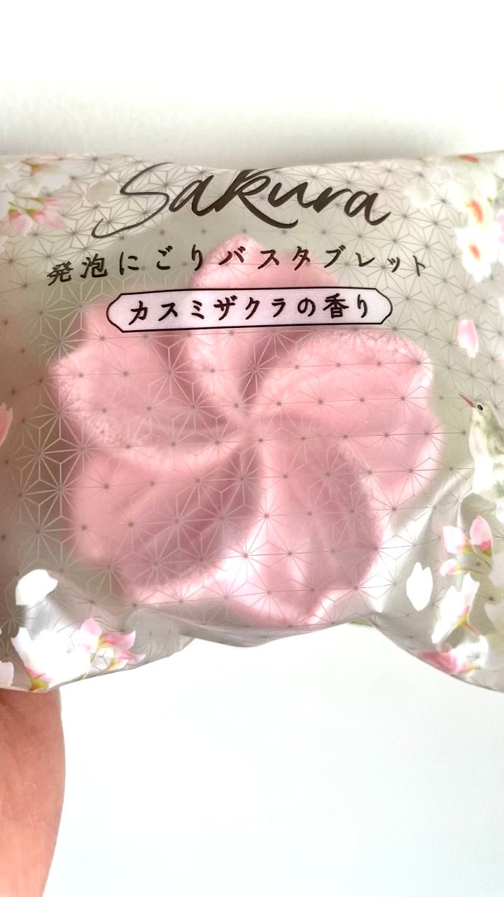 和菓子のような桜モチーフの発泡入浴料。お湯に入れるとシュワシュワ溶け出し、肌をうるおすにごり湯が楽しめます。ふんわり広がる桜アロマと一緒に季節を感じるバスタイムを。