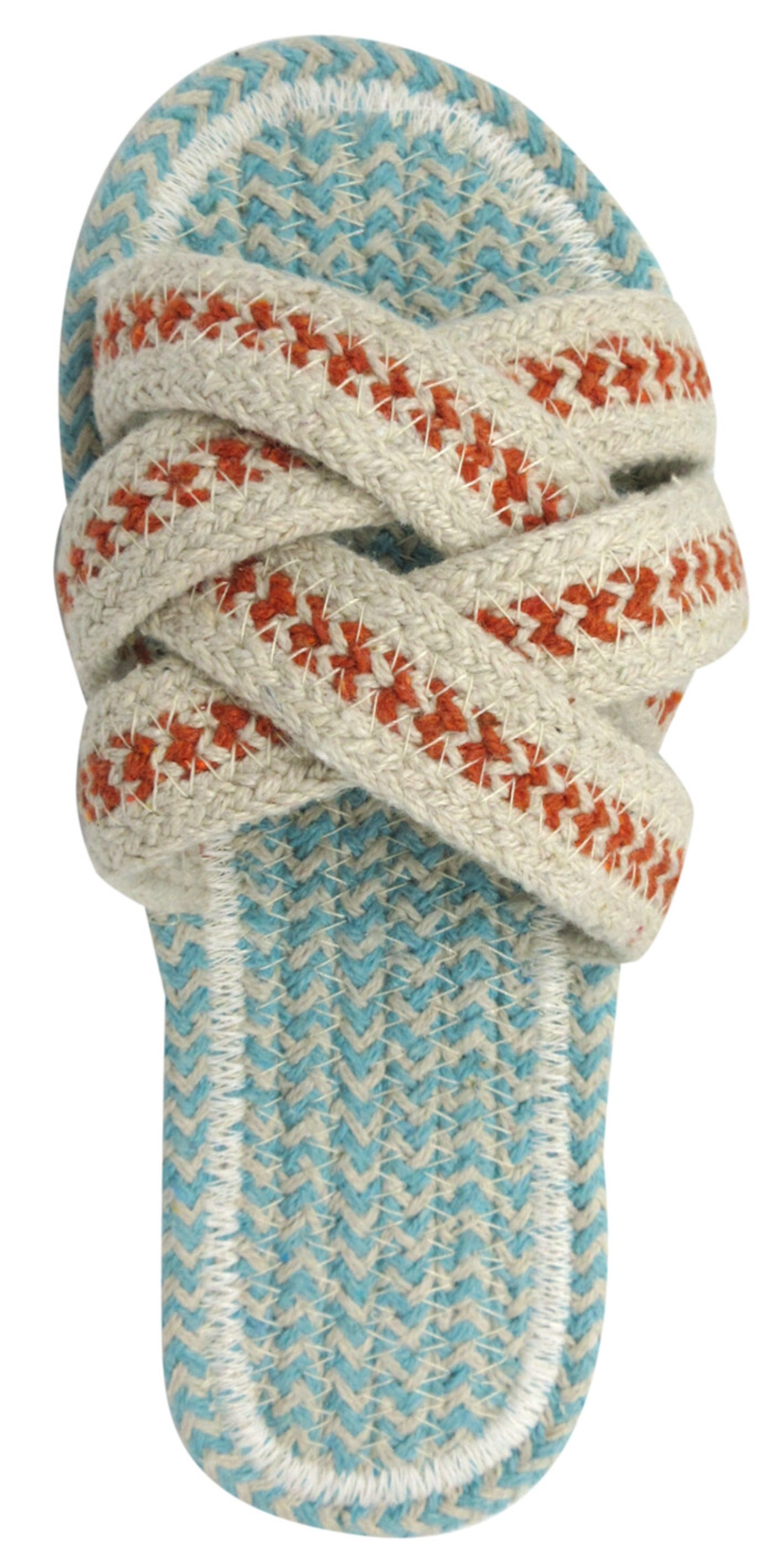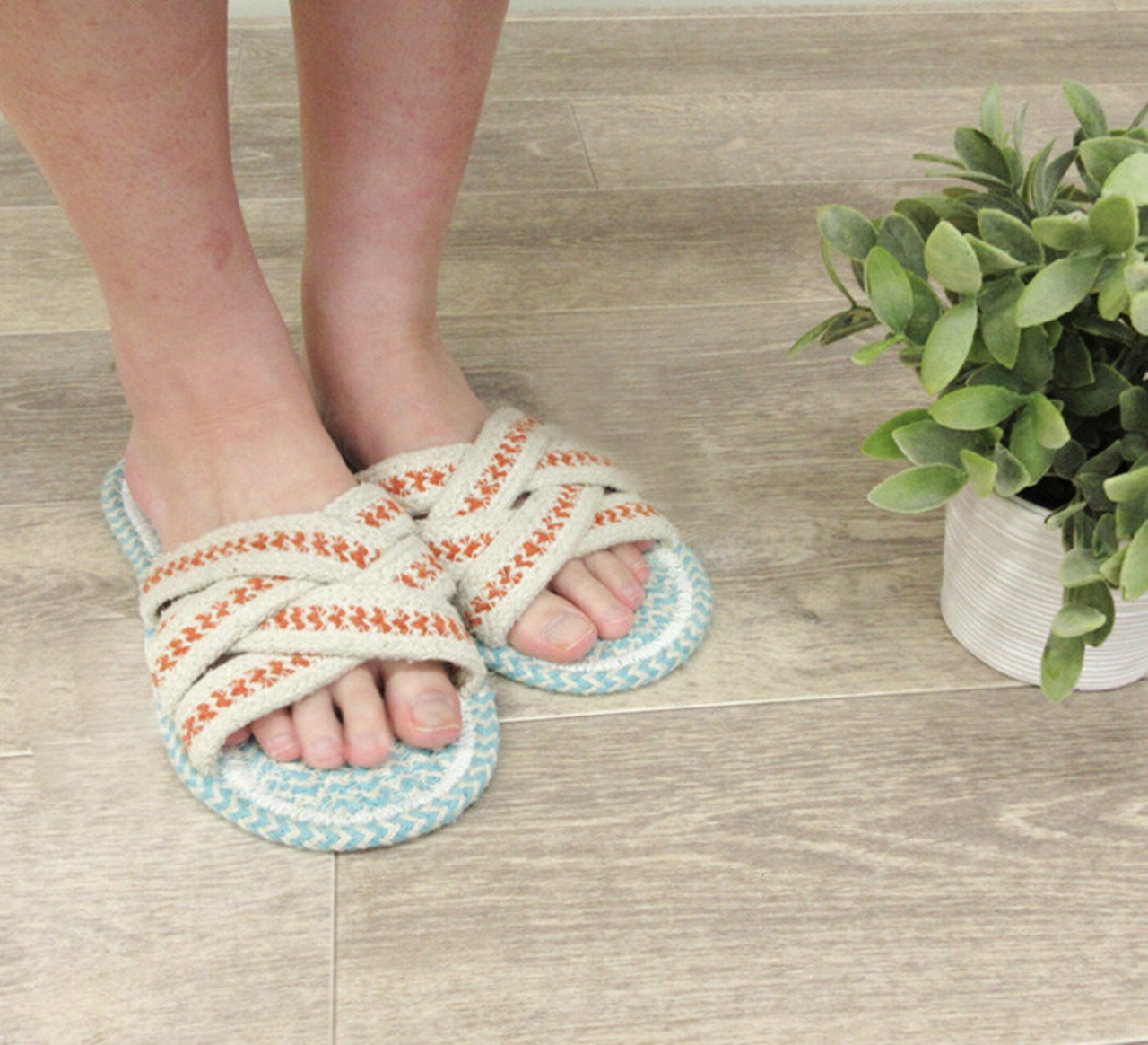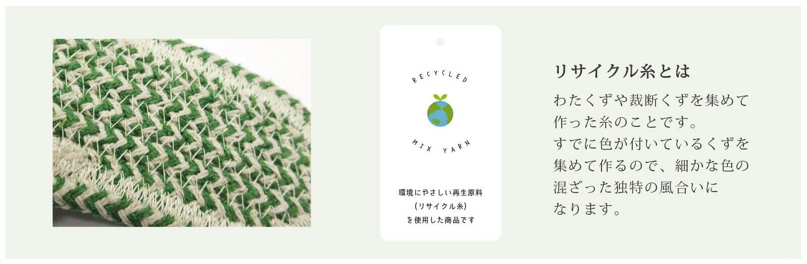 資源を大事にし、環境に優しいリサイクル糸を使用したスリッパ。元々色がついているくずを集めて作っているので細かい色の混ざった独特の風合いをお楽しみください。見た目も履き心地も涼しげで春夏にはぴったりなアイテム♪