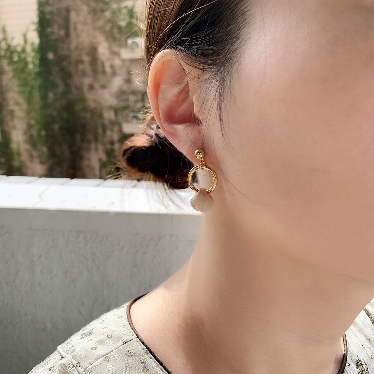 淡い落ち着いたカラーの樹脂にゴールドの光沢が映え、お顔周りに程よくアクセントを加えます。ミニマルなサイズ感で、さまざまなコーディネートに馴染む、デイリーにお使い頂ける一品です。シンプルなデザインなので、他のアクセとの重ねづけも◎