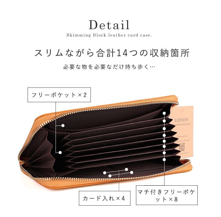 まとめて収納出来るように便利なカードポケット、印鑑ポケット付き。少し横長でお札も入れやすい構造です。スキミング防止機能付いて、どこにでも安心して持ち歩けます。磁気シールド素材が内蔵されているので通帳はもちろんクレジットカードやパスポートなどの貴重品入れにも便利です。