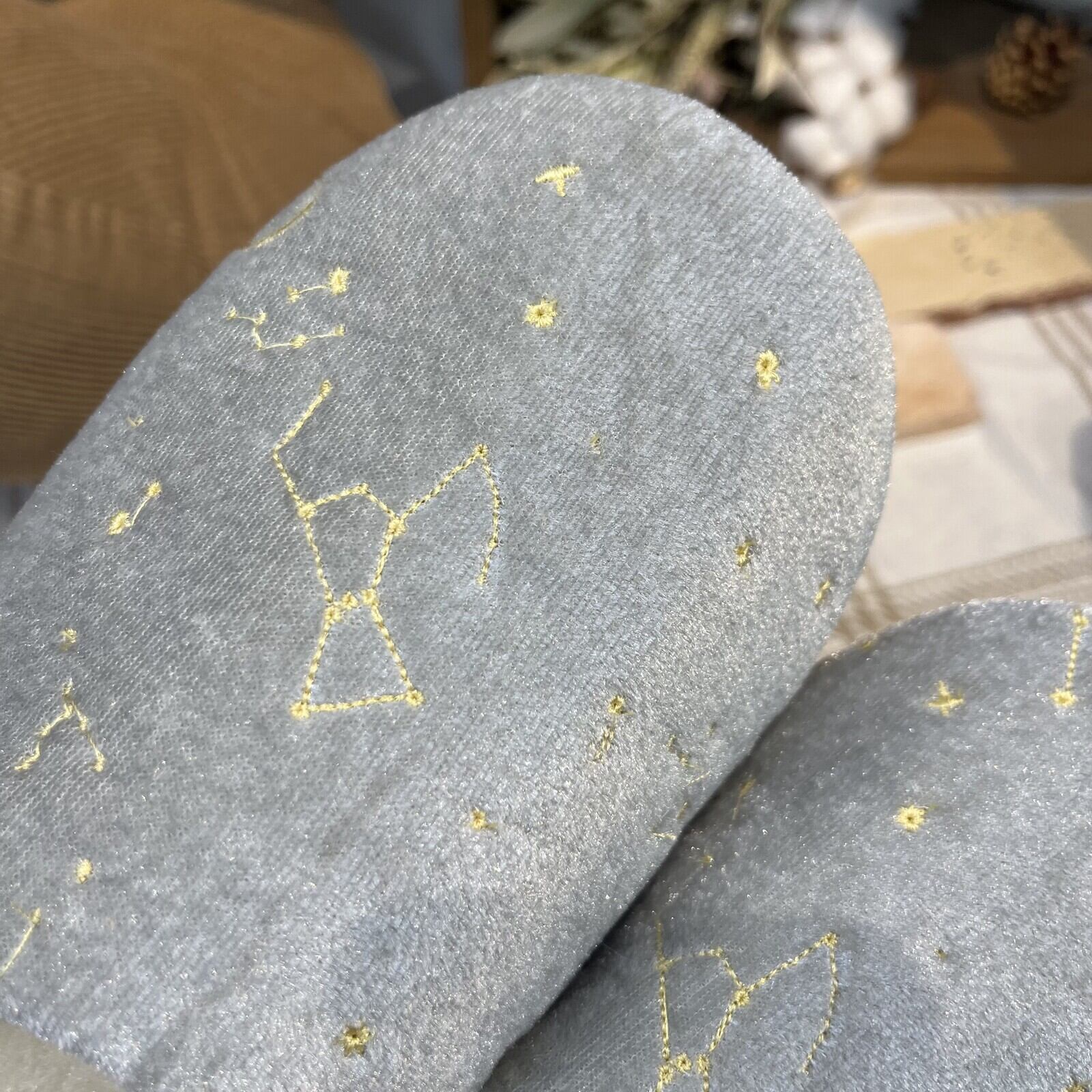 夜空をイメージしたロマンティックな雰囲気漂うバブーシュスリッパ。星や月、星座をイメージしたデザインと落ち着いたシックなカラー展開のアイテム。底面はスエード調の素材を使用しており、フローリングでも滑りにくいのがうれしいポイントです。